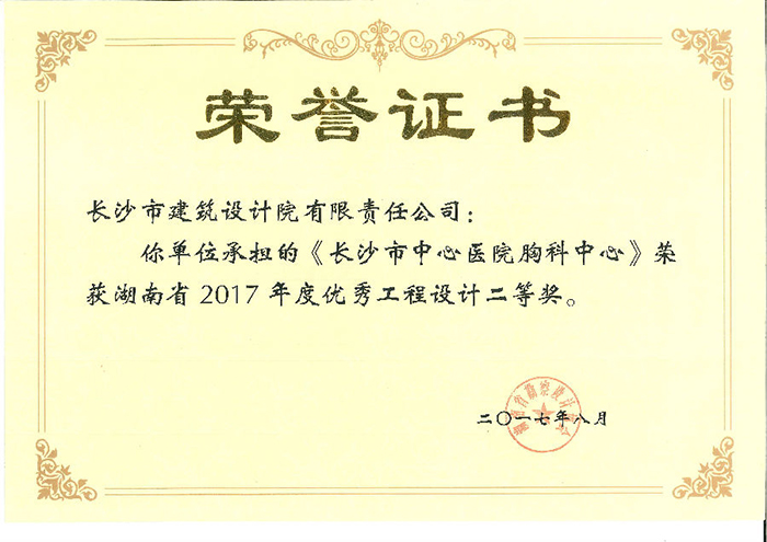熱烈慶祝我院“長沙市中心醫(yī)院胸科中心”項目榮獲2017年度湖(hú)南省優秀工程設計(jì)二等獎